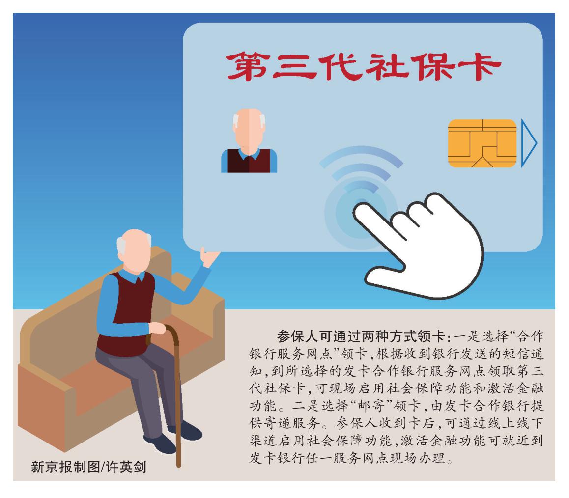 集中换发期间,第三代社保卡自申领之日起30个自然日内完成制作,离退休人员可通过两种方式领卡。一是选择“合作银行服务网点”领卡,根据收到银行发送的短信或电话通知,到所选择的发卡合作银行服务网点领取,同时可现场启用社会保障功能和激活金融功能。二是选择“邮寄”领卡,由发卡合作银行提供免费寄递服务。离退休人员收到卡后,可通过线上线下渠道启用社会保障功能,还可以就近到发卡银行任一服务网点现场激活金融功能。