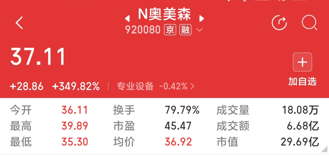 10月10日,奥美森智能装备股份有限公司(简称“奥美森”,证券代码“920080”)登陆北京证券交易所。新股上市首日受资金热捧,截至收盘大涨349.82%。奥美森是北交所第278家上市公司。