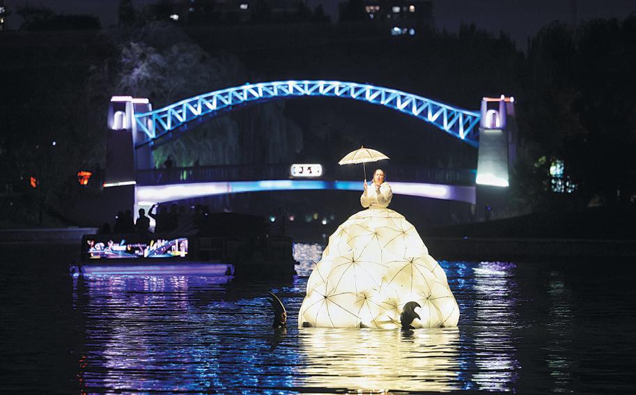 10月11日,2025北京朝阳国际灯光消费季启动,演员在贝壳剧场水域中央与鲲鹏共舞。 摄影/新京报记者 王飞