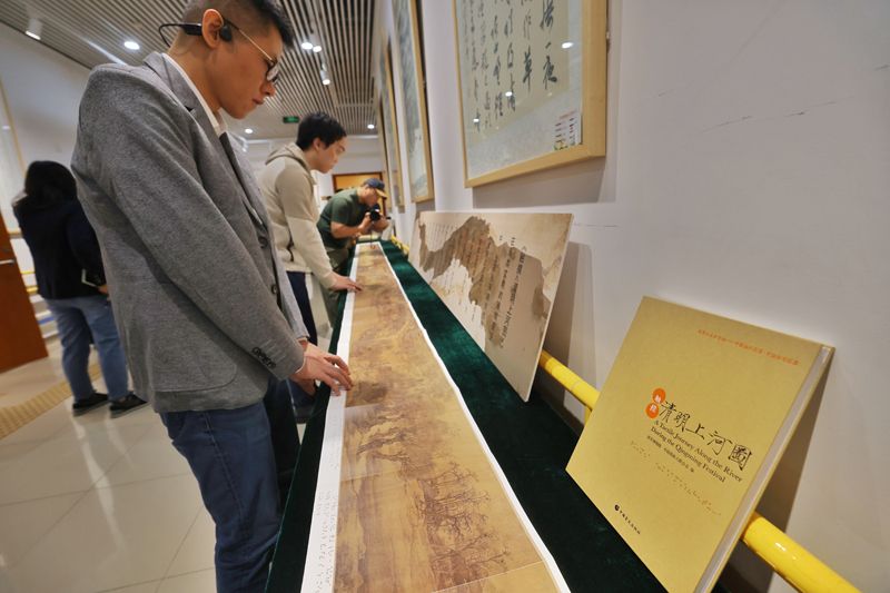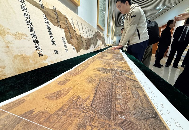 视障读者触摸“十里汴河连市井,万民熙攘乐丰年”长卷,品味画意。