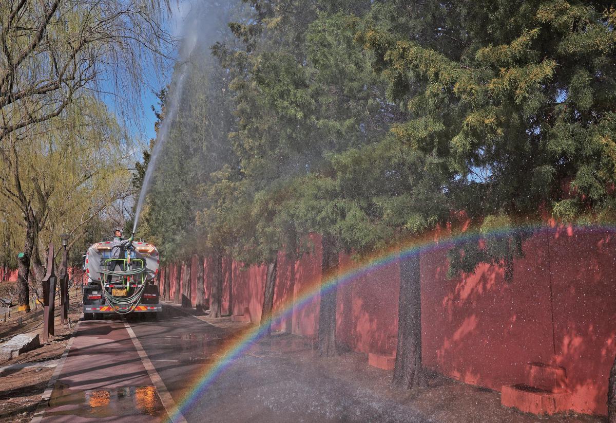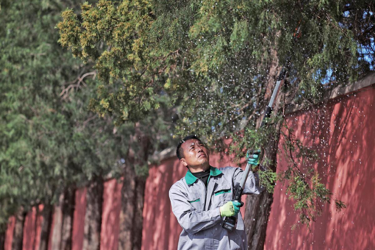 3月19日,红领巾公园,工作人员对路侧的桧柏洒水喷淋,以减少花粉飘散量。 摄影/新京报记者 薛珺
