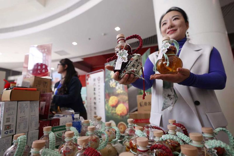 10月14日,新华社综合楼,“品亳州味道 鉴养生之道”亳州市“双招双引”推介会和安徽亳州特色美食周举行。来自亳州市52家企业的580余种产品,通过“展示+品鉴+体验”的方式,让京城消费者零距离感受亳州的独特魅力。图为工作人员展示药膳饮品。