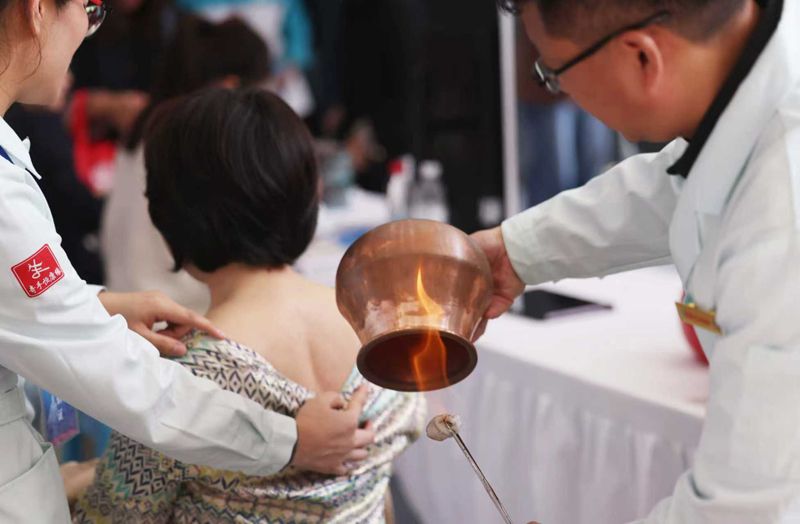 观众体验在亳州当地广受欢迎的铜火罐诊疗法。该疗法具有疏通经络、祛寒除湿的功效。
