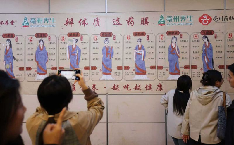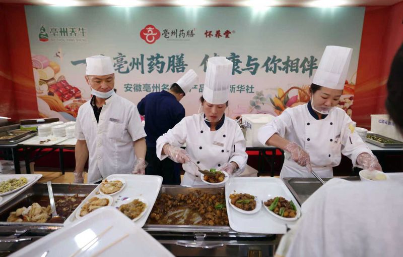 观众体验亳州特色药膳菜品、点心及汤饮。