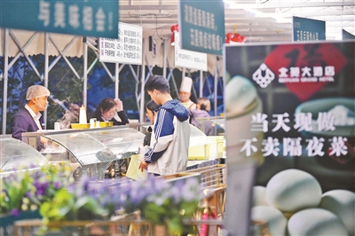 在几公里外的昌平区,星级酒店北京回龙观酒店的外摆集市同样热闹,摊位上分类摆放着热辣卤味、精美凉菜和现做主食,摊位旁边围满了顾客。几名酒店大厨穿着洁白的厨师服,戴着高挺的厨师帽,在摊位后熟练地分装菜品,动作麻利又不失专业范儿。“我们这肘子都是选的上乘前肘,慢火酱卤4个小时,保证骨酥肉烂,您尝一块就知道!”厨师长郭师傅一边给顾客切着酱香肘子,一边热情地介绍。不少居民围在摊位前你一言我一语地边问边买,手中的购物袋很快便装得满满当当。