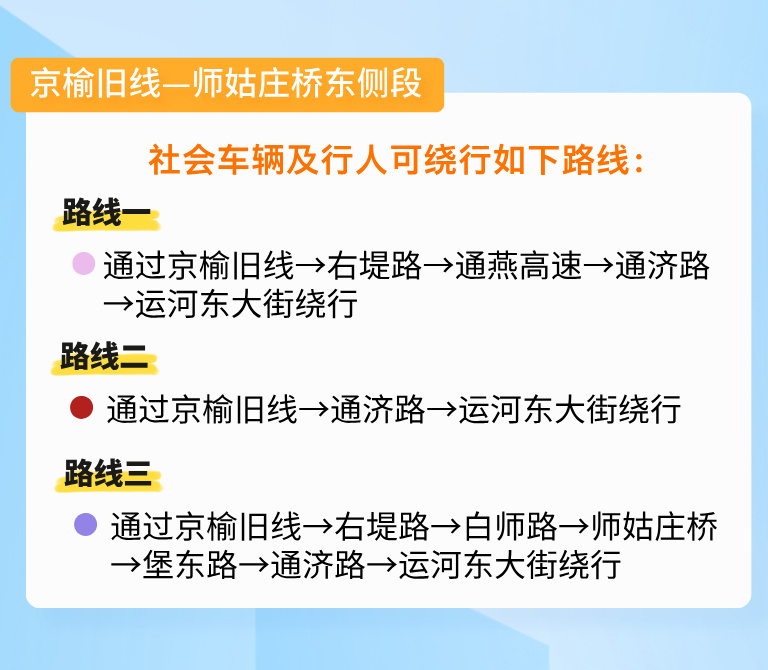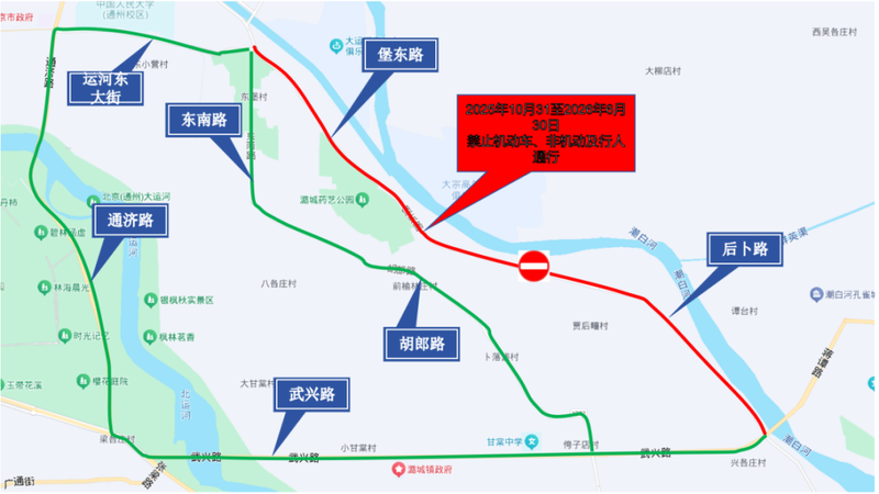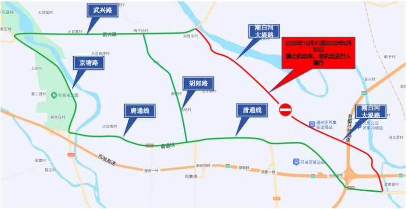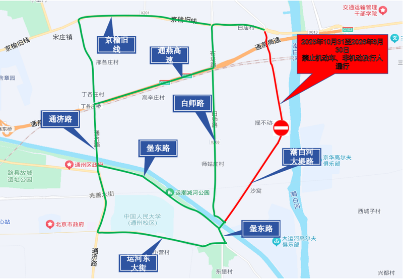 为配合实施潮白河综合治理与生态修复工程(通州段),提升城市防洪安全水平,保证施工期间的道路交通安全,自2025年10月31日20时起至2026年6月30日24时止,对潮白河右堤路(京榆旧线-唐通线)道路进行分段封控。请广大市民出行注意绕行。