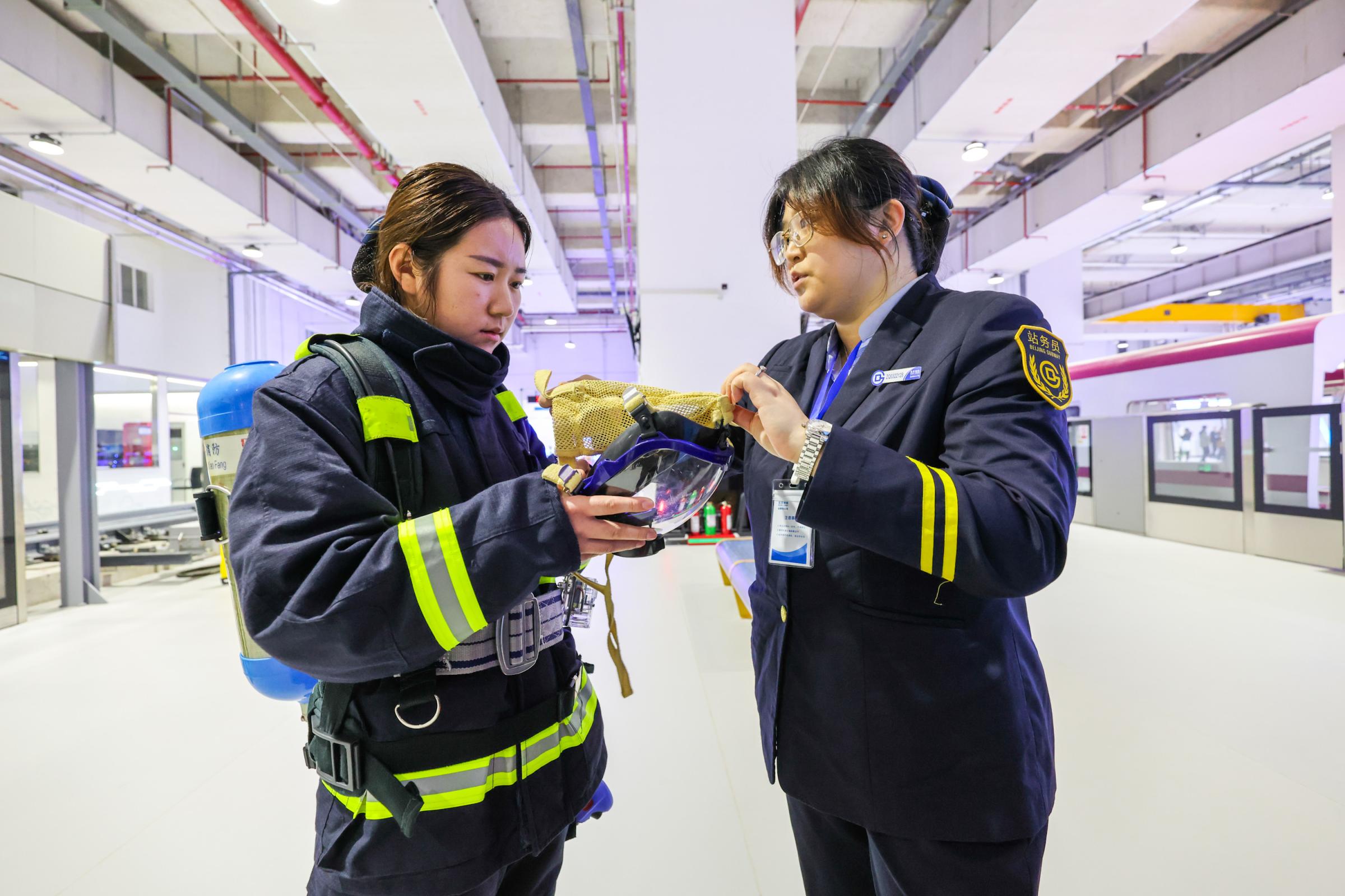 学员在站厅站台应急处置实训区学习消防技能。
