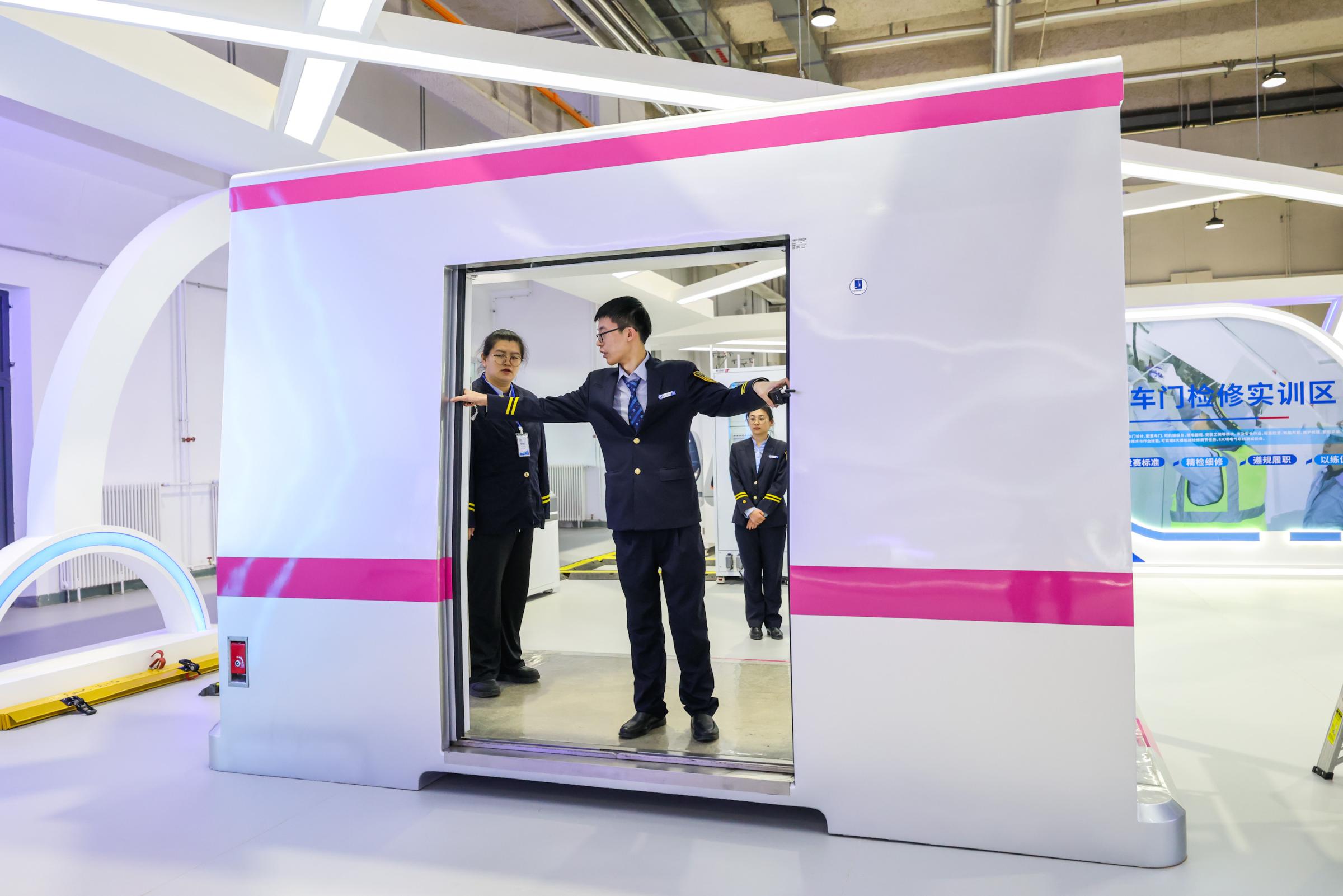 学员在车门检修实训区演练车门故障应急处置。