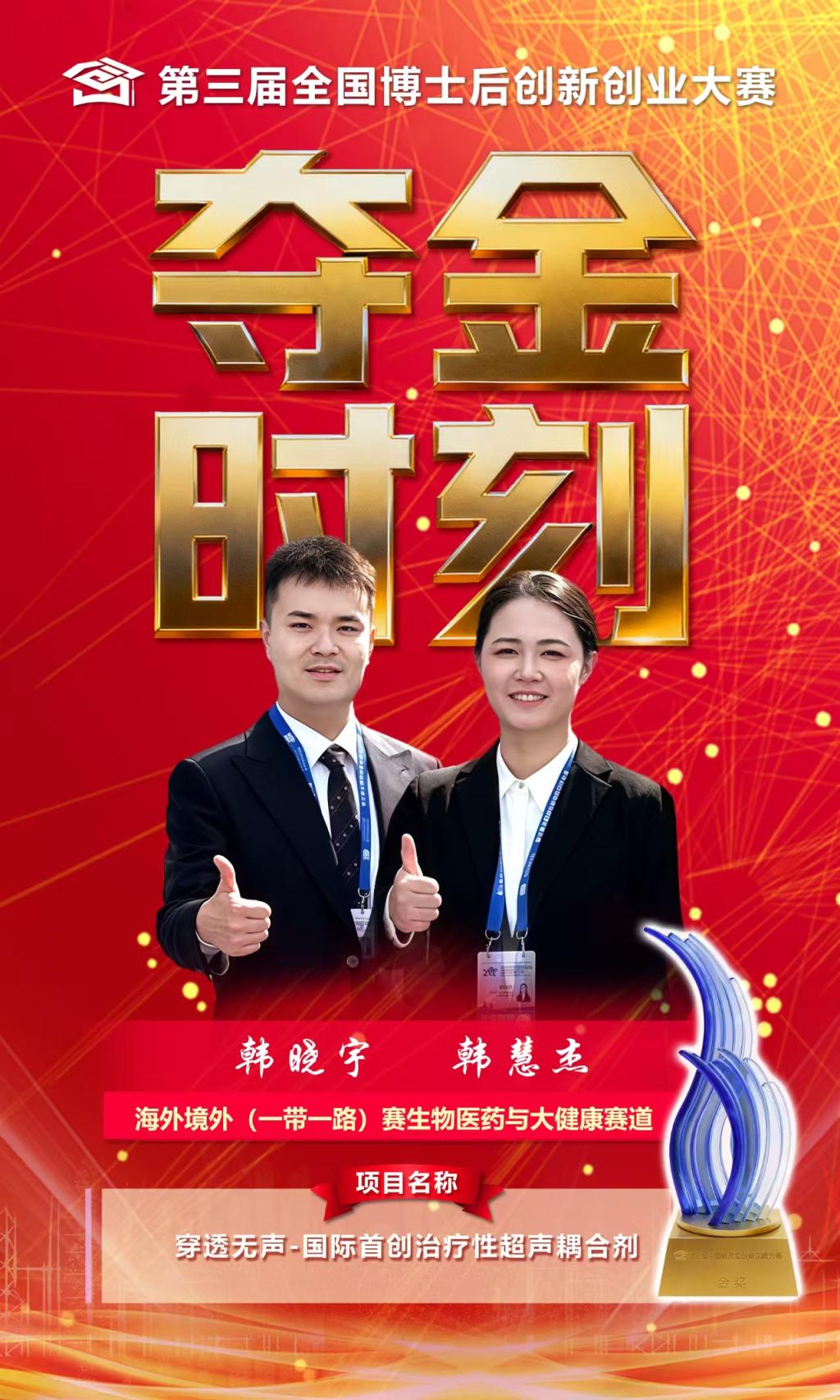 韩慧杰(北京工业大学)和韩晓宇(重庆医科大学)带来的“穿透无声—国际首创治疗性超声耦合剂”项目摘得海外境外(一带一路)赛道金牌。传统贴膏普遍存在起效缓慢的问题,能否让药物穿透得更深,让疗效来得更快?来自重庆医科大学和北京工业大学的博士后研发团队,从被忽视的“耦合剂”入手,研发出国际首创的治疗性超声耦合剂,能够将超声经皮给药速率较传统贴膏乳膏提升十几倍。