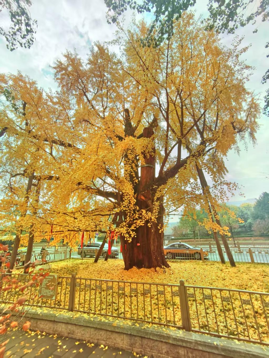 秋意正浓,人们途经石景山路玉泉医院门前时,常被两棵古银杏树所吸引。这两棵古树树龄约700年,虬曲苍劲、叶茂枝繁,随着叶片次第变黄,犹如在街边撑起了两把金黄色的巨型伞盖,沧桑中透出生命遒劲的力量。如今,两棵古银杏迎来一年中最美的季节,限定款秋色美不胜收,吸引路人驻足欣赏。