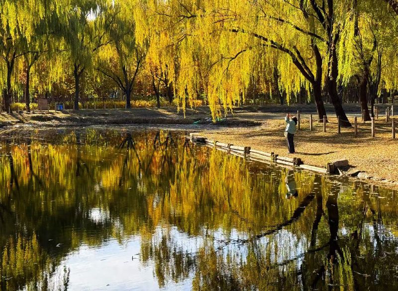 11月9日,北京秋色斑斓,古塔公园,岸边金黄色垂柳与水中倒映相映成趣。