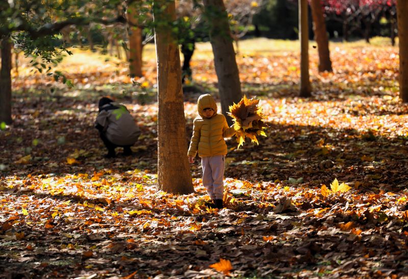 11月9日,古塔公园,小朋友穿梭在林间捡拾树叶。