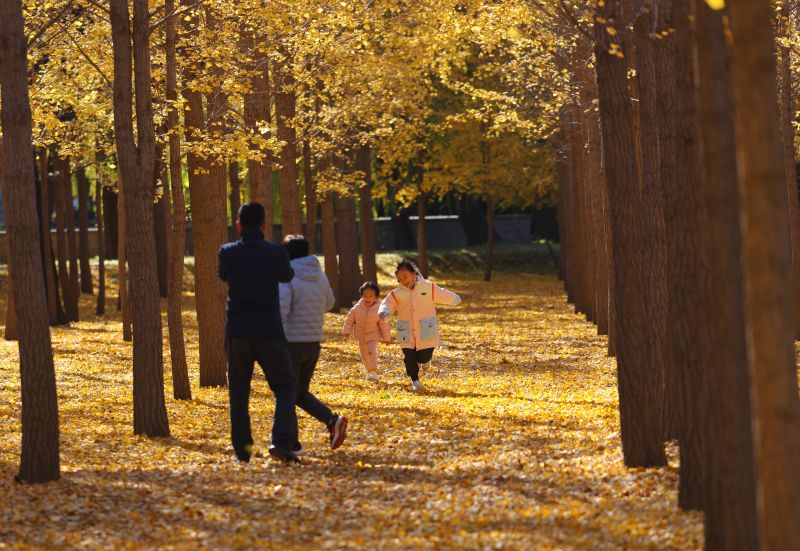 小朋友在银杏林中肆意奔跑,享受秋日野趣。