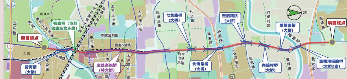 安立路快速化改造工程的南端起点是双营路,其位于地铁5号线北苑路北站和立水桥南站之间,是居住小区密集的区域,周边的交通压力较大,早晚高峰时段拥堵明显。高架桥道路建成后,车辆就可以一路走快速路,没有信号灯,能够更快速地从回天地区往来北京中心城区。