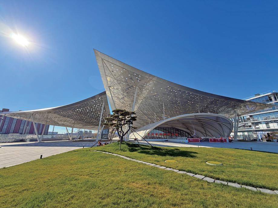 “京帆”屋盖寓意“扬帆起航、千帆竞发”,由7片主帆和3片小帆组成,具有车站屋盖、城市景观、城市公共客厅等多种城市功能,未来结合广场绿色景观,将打造檐下绿色城市会客厅。