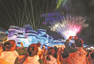 无人机在天空中摆出“京堰研学 惊艳之旅”字样,引发学生欢呼