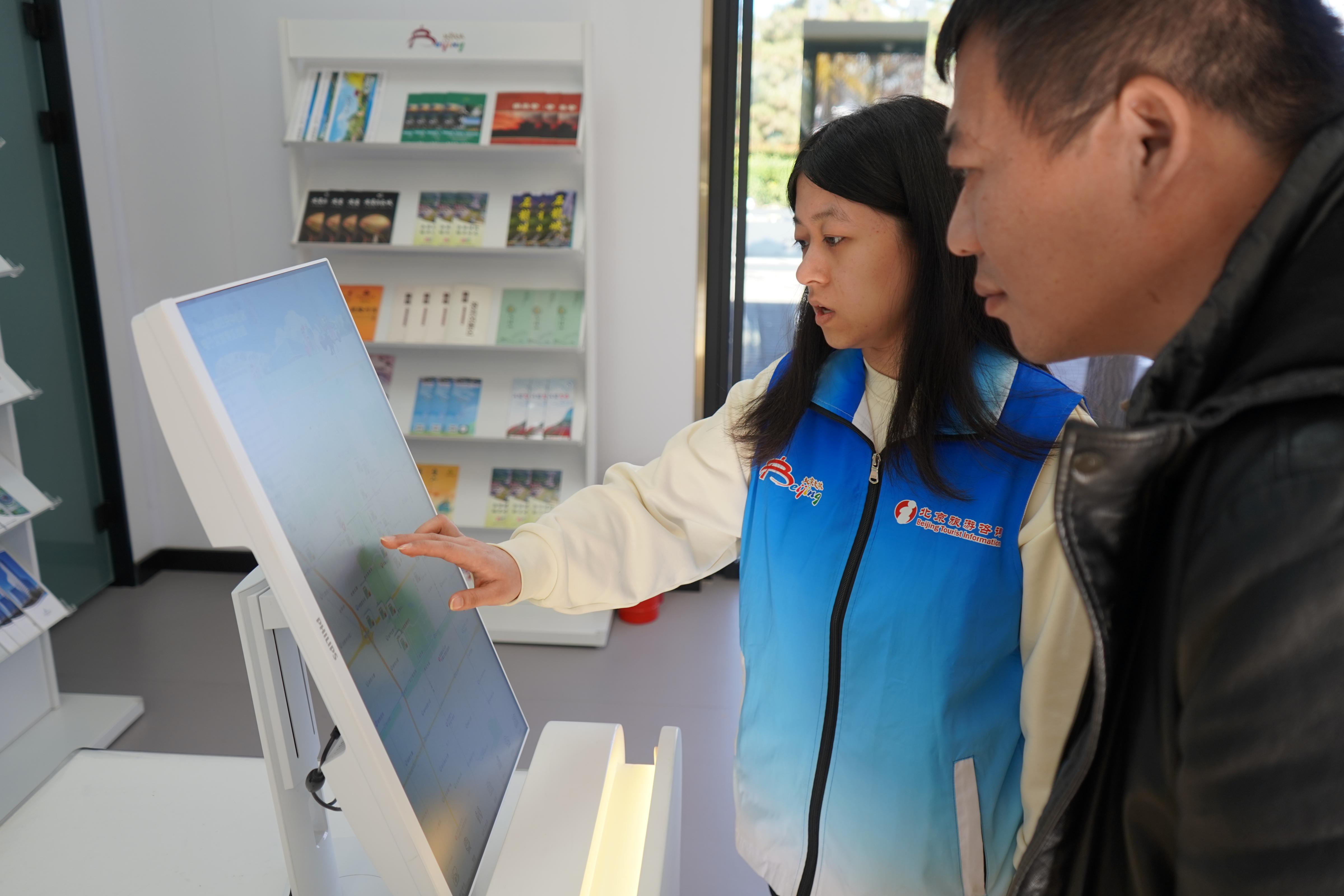 咨询员借助智慧旅游电子地图,为游客规划游览线路。
