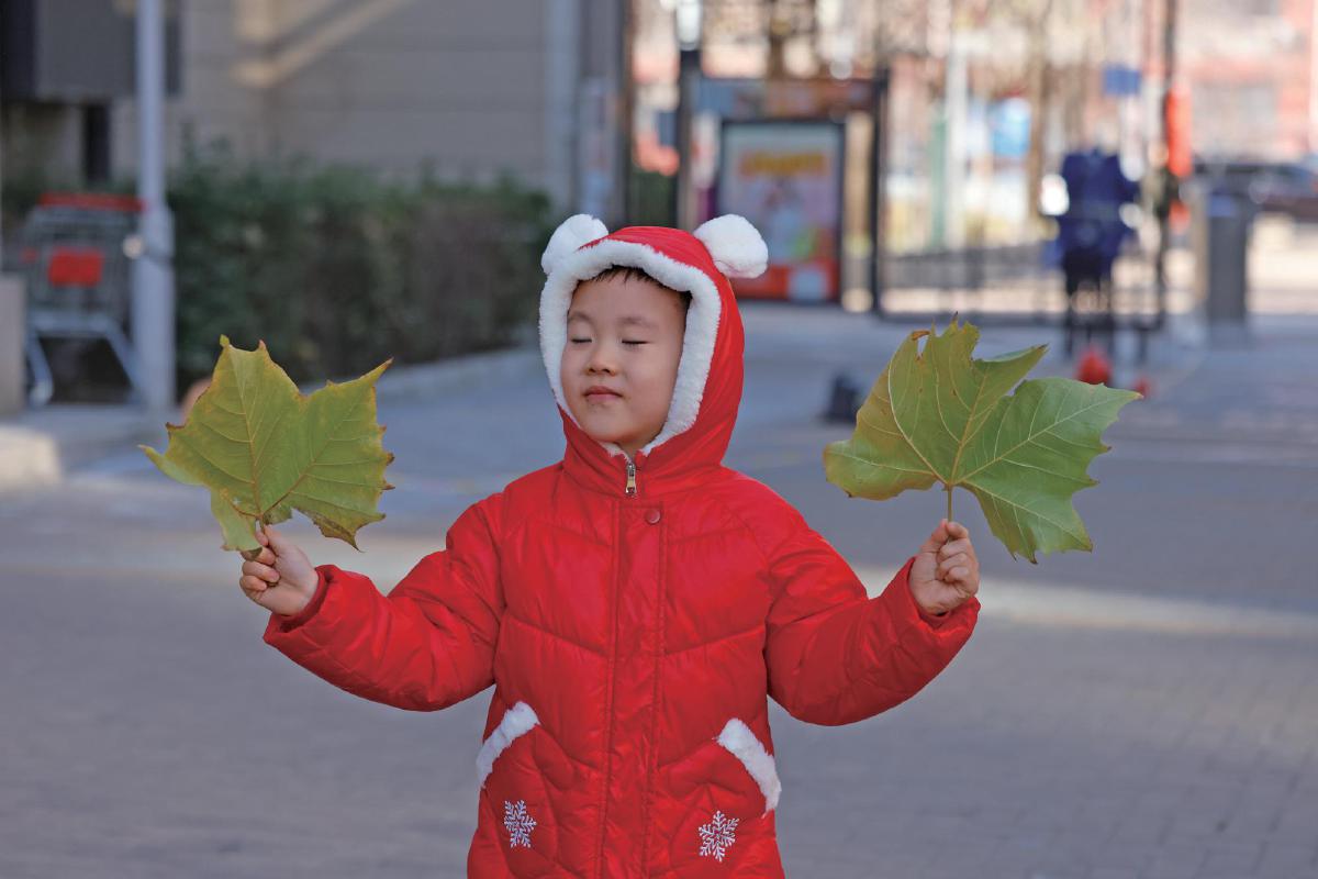 场景:小朋友手拿两片大树叶,大风吹得他睁不开眼。