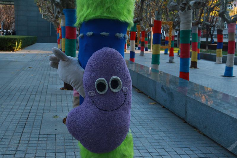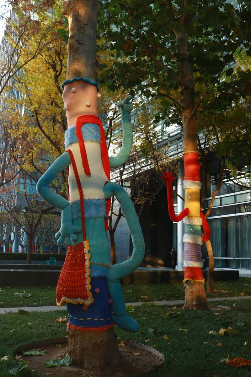 11月17日上午,寒风吹得树叶摇晃,路人们冷得把脖子缩在衣领,行色匆匆。在海淀区中关村南三街附近,路边小广场透出五颜六色的色彩,一排排梧桐树裹着彩色的限定款毛衣,像卫兵一样整齐排列。梧桐树的树干上,彩色棉麻线层层叠叠,明黄撞色宝蓝,玫粉色叠加奶白色,一圈圈麻线里还藏着毛茸茸的绒球、粉花,有棵树的“袖口”处还“长”出了一个瞪圆眼睛的绿色星星玩偶,仿佛举着白手套朝路人挥手。