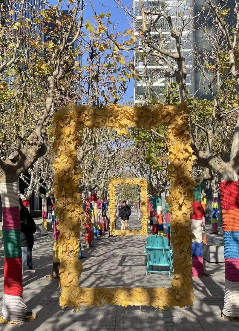 最吸睛的是步道中央那几幅银杏“相框”,金黄的银杏叶被编进相框,路人们行走在“毛衣树”广场,也成了银杏相框中的主人公。中午时分,小广场周边的上班族们纷纷走出办公室,到小广场散步,袁女士说,梧桐树月初就穿上毛衣了,“再过一阵树叶落光后,冬天就显得没有太多亮色。有了这些多巴胺色彩的树木,中午下楼遛弯的心情都变得不一样。我还邀请朋友们来这里打卡呢。”