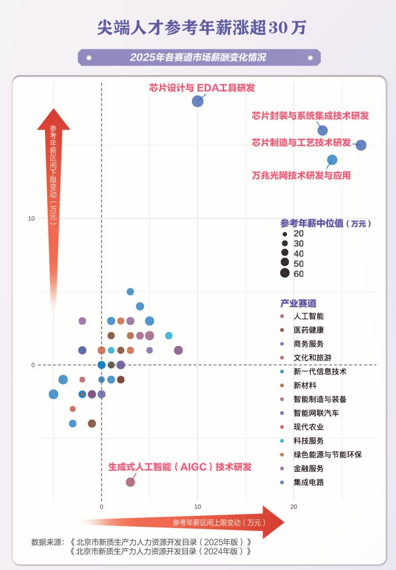 新京报记者对比发现,与2024年相比,今年《目录》核心开发领域从60个精简至58个,人工智能从新一代信息技术中独立成列;同时,“专家”一词出现频次由28次增至31次,参考年薪区间整体上移。这些变化释放出明确信号——北京的人才需求正进一步向尖端人才聚焦。
