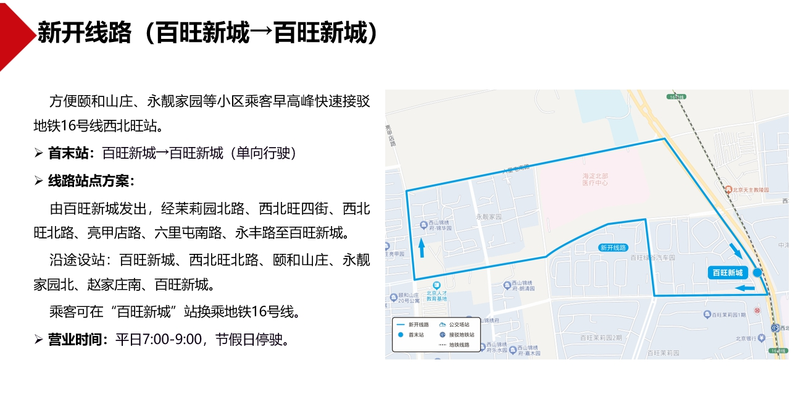 据“北京交通”微信公众号消息,为优化全市公交线网布局,提高有关区域出行服务水平,提升公共交通运行效率,市交通委组织公交集团制定了8条公交线路优化调整方案,包括新开百旺新城接驳线路,方便颐和山庄、永靓家园等小区乘客早高峰快速接驳地铁16号线西北旺站。