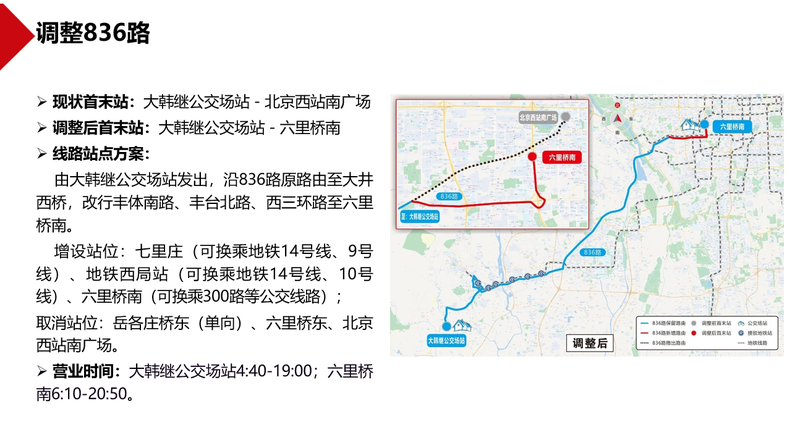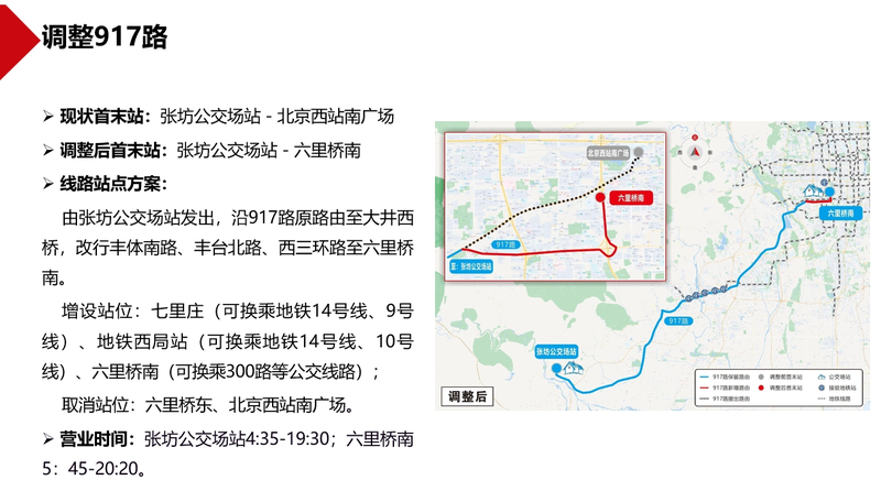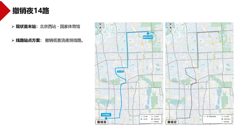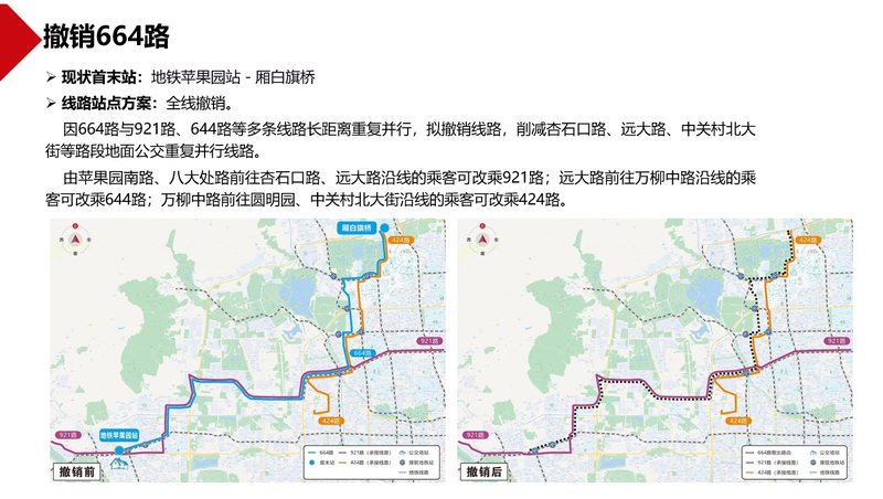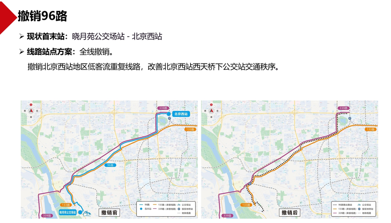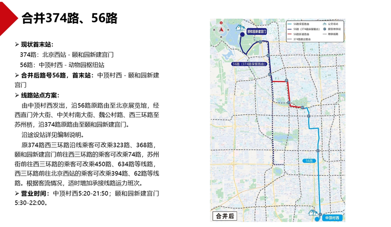 调整836路、917路,强化两条线路与地铁9号线、10号线、14号线等多条地铁线及三环路地面公交干线的接驳功能。合并374路、56路,优化西三环辅路地面公交重复并行线路,增加颐和园新建宫门地面公交服务方向。撤销北京西站地区低客流重复线路96路,改善北京西站西天桥下公交站交通秩序。撤销664路,削减杏石口路、远大路、中关村北大街等路段地面公交重复并行线路。撤销低客流夜班线路夜14路等。现对上述公交线路优化方案网上公开征求意见,欢迎社会各界提出意见建议。