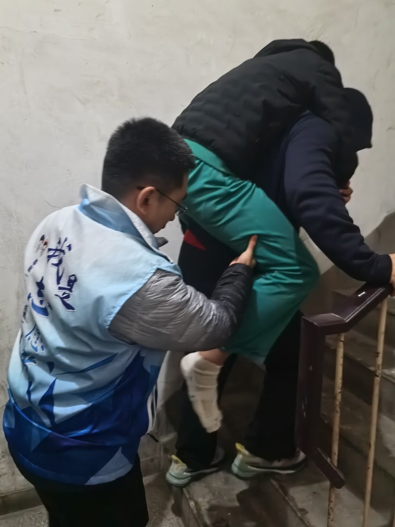 为减少孩子颠簸,社区工作人员韩少晨和文放,采用“轮换背负+协同防护”方式:一人稳稳背起孩子,另一人从后托住孩子腿部,每走两层便短暂休息调整姿势。特别是在楼梯转角处,工作人员更会放慢速度,确保孩子的脚不会受到二次伤害。经过约20分钟,孩子被顺利送到家门口。