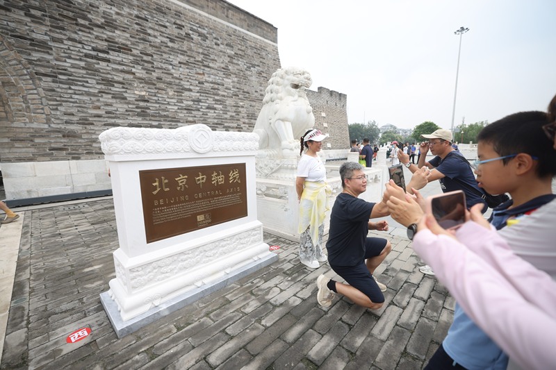 2025年7月27日,“北京中轴线世界文化遗产标志碑”前,市民拍照留念。资料图片/新京报记者 王贵彬 摄