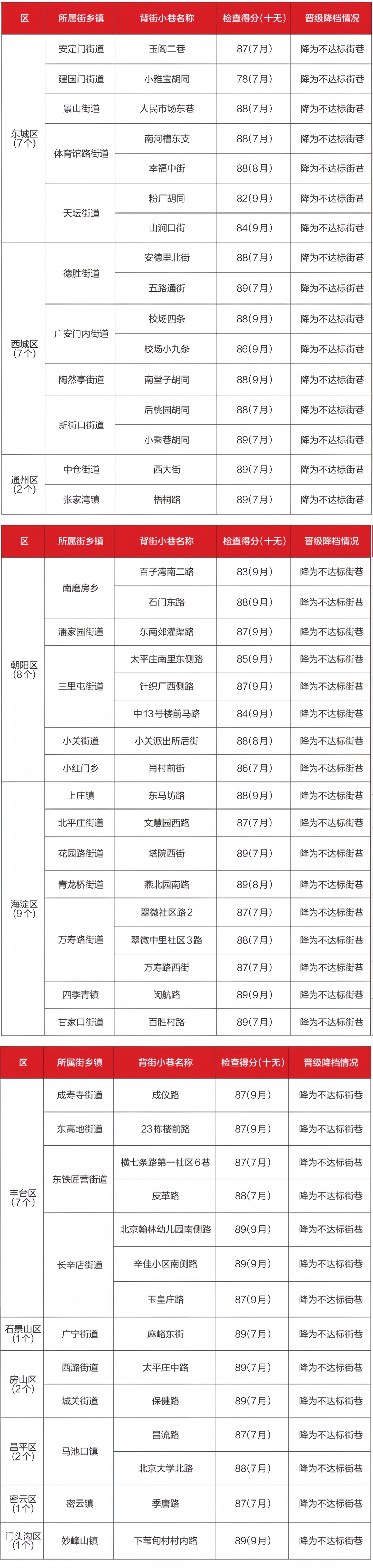 一是复档情况。2025年第二季度降档的54条街巷,在2025年第三季度市级日常检查中连续三个月检查得分90分以上,恢复为达标街巷。二是降档情况。第三季度全市按照达标街巷标准实施降档。共有47条背街小巷“十无”检查得分在90分以下,降为不达标街巷,其中海淀区9条,朝阳区8条,东城区、西城区、丰台区各7条,通州区、房山区、昌平区各2条,石景山区、密云区、门头沟区各1条。(详见附表)