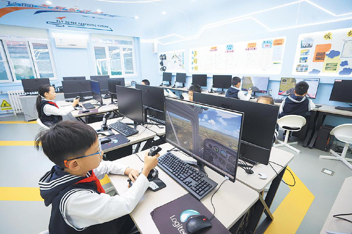 11月27日,朝阳区实验小学学生们上模拟飞行课。新京报记者 王飞 摄
