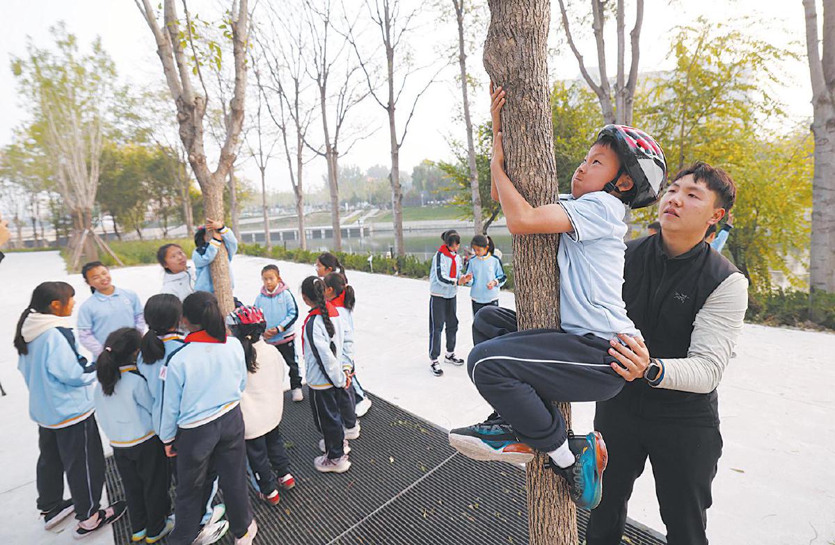 10月28日,在凉水河畔的“乐学公园”内,丰台外国语学校学生的“爬树课”准时上课。 新京报记者 李木易 摄