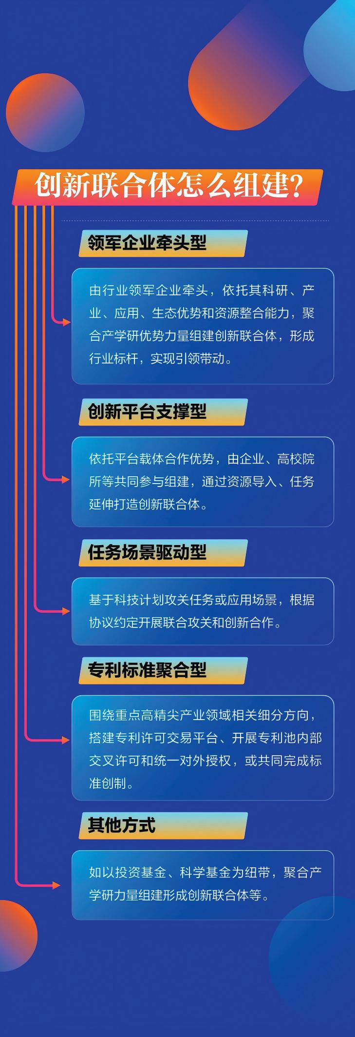 按照依托载体不同,创新联合体组建方式主要包括领军企业牵头、创新平台支撑、任务场景驱动和专利标准聚合,以及基金等其他适用的方式等。其中,领军企业牵头型,由行业领军企业牵头,依托其科研、产业、应用、生态优势和资源整合能力,聚合产学研优势力量组建创新联合体,形成行业标杆,实现引领带动。