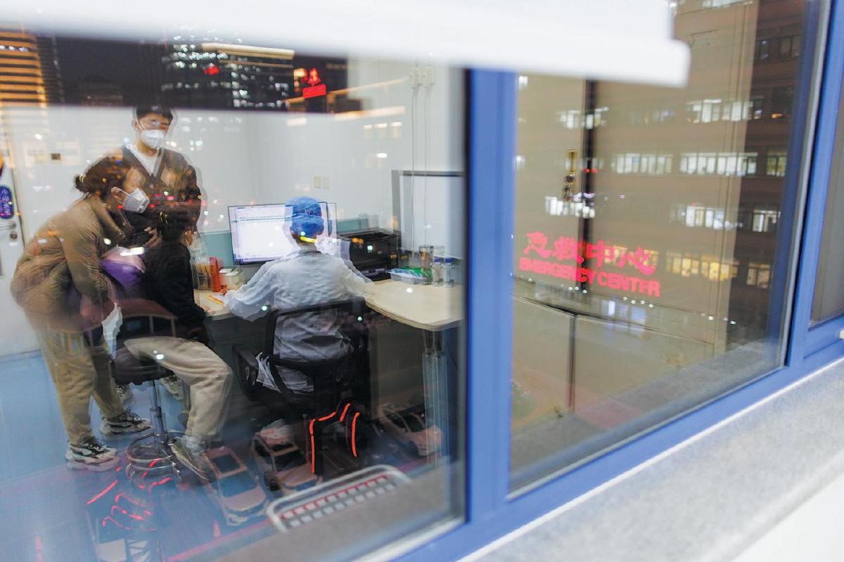 11月30日晚8时,北京儿童医院呼吸中心副主任医师刘军与患者的身影映在玻璃上。