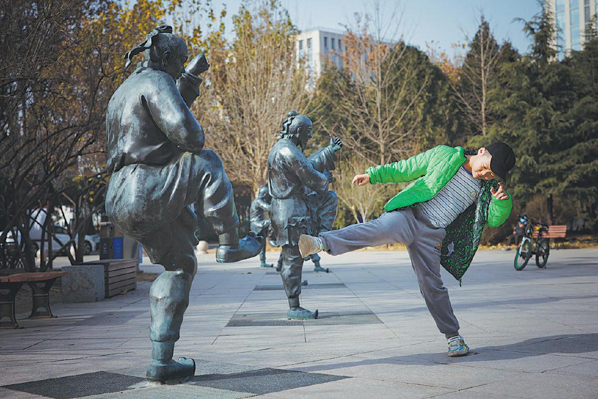 场景:小朋友正和打五禽戏的铜像“比武”。新京报记者王贵彬 摄
