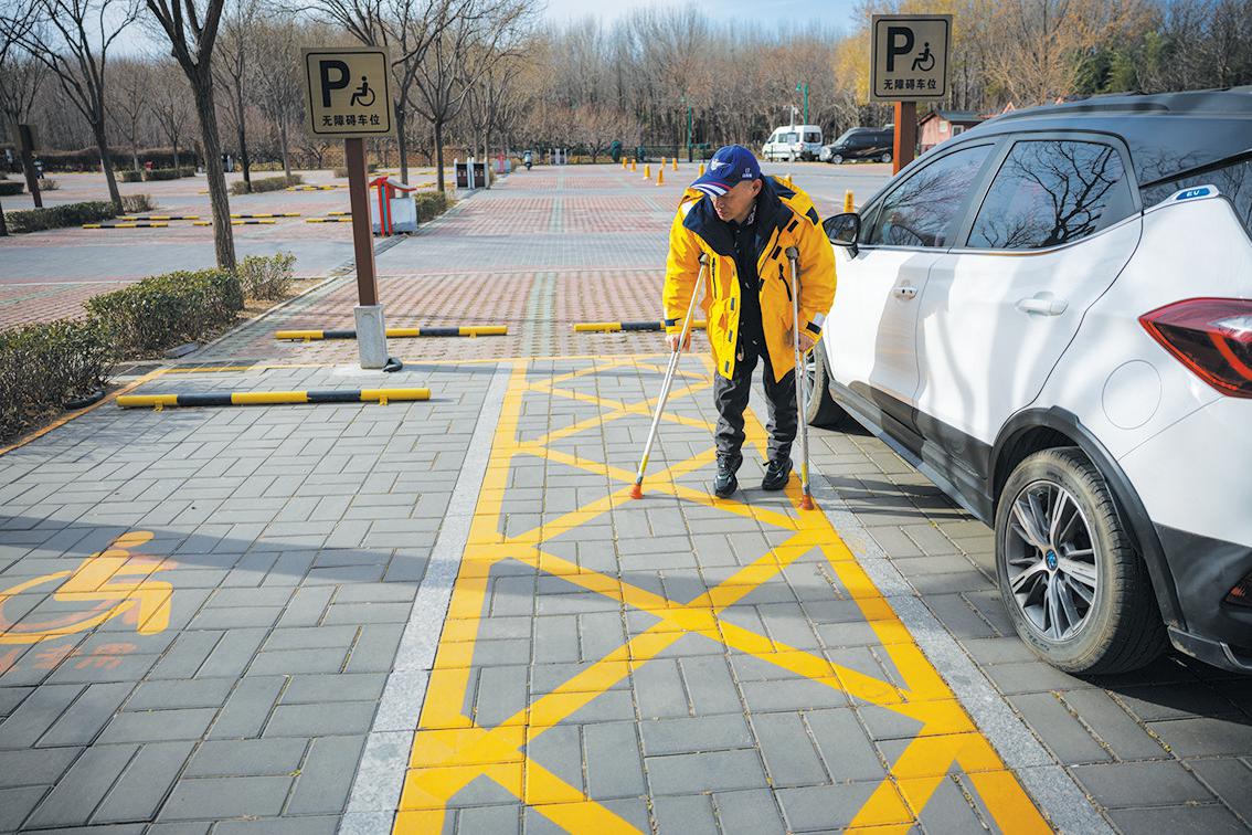 12月1日,通州区漕运码头停车场,张屹在无障碍停车位前查看,他认为设施基本符合规范。