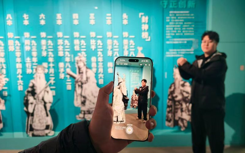 VR互动环节,观众可扫码与周信芳塑造的经典人物形象合影留念。新京报记者 浦峰 摄