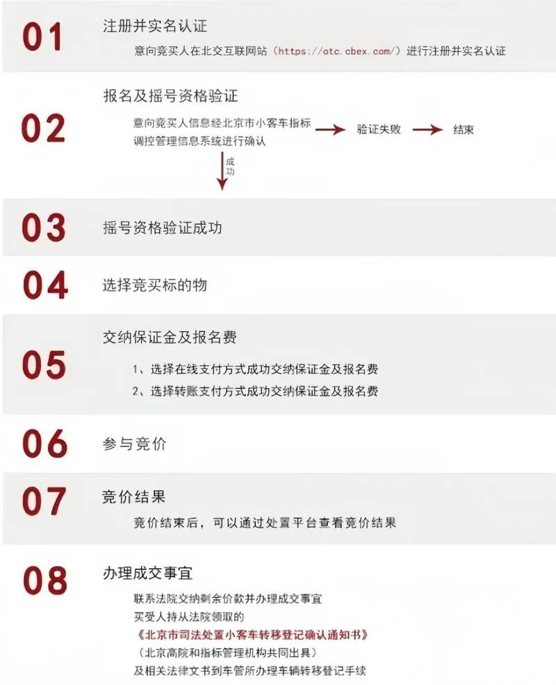 提示广大竞拍者,按照规则成功竞买后,买受人根据要求履行完交齐成交价款等相关程序,可持北京高院和指标管理机构共同出具的《北京市司法处置小客车转移登记确认通知书》,在有效期内到公安机关交通管理部门办理转移登记手续,车辆原号牌号码不再保留。