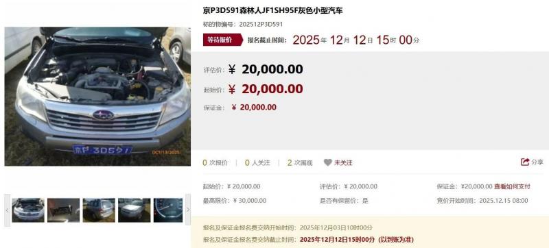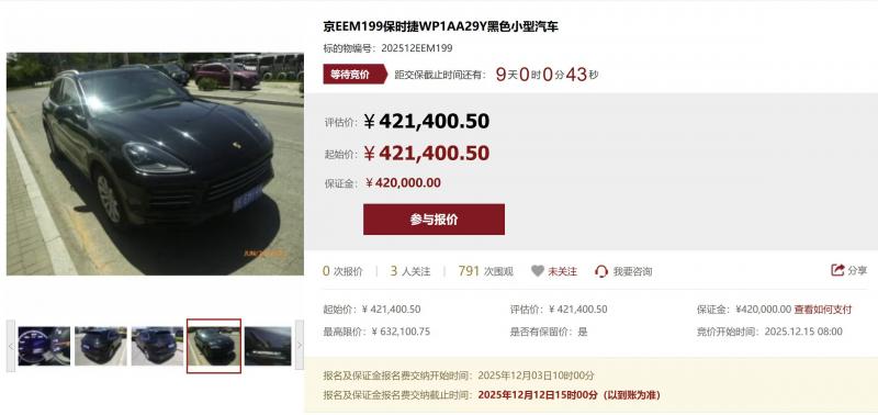 北青报记者注意到,本次司法处置的小客车中,评估价最高的42.14万元,是一辆2018年的保时捷小型汽车,该车辆初次登记日期为2018年12月10日,图片显示里程表显示行车里程(约)24068km,目前查违章记录无违章、无罚款。