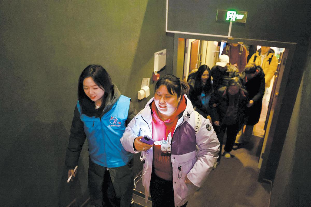 12月1日,万达影城(望京店),中国传媒大学的学生志愿者带视障人士走进影院。 本版摄影/新京报记者 王飞