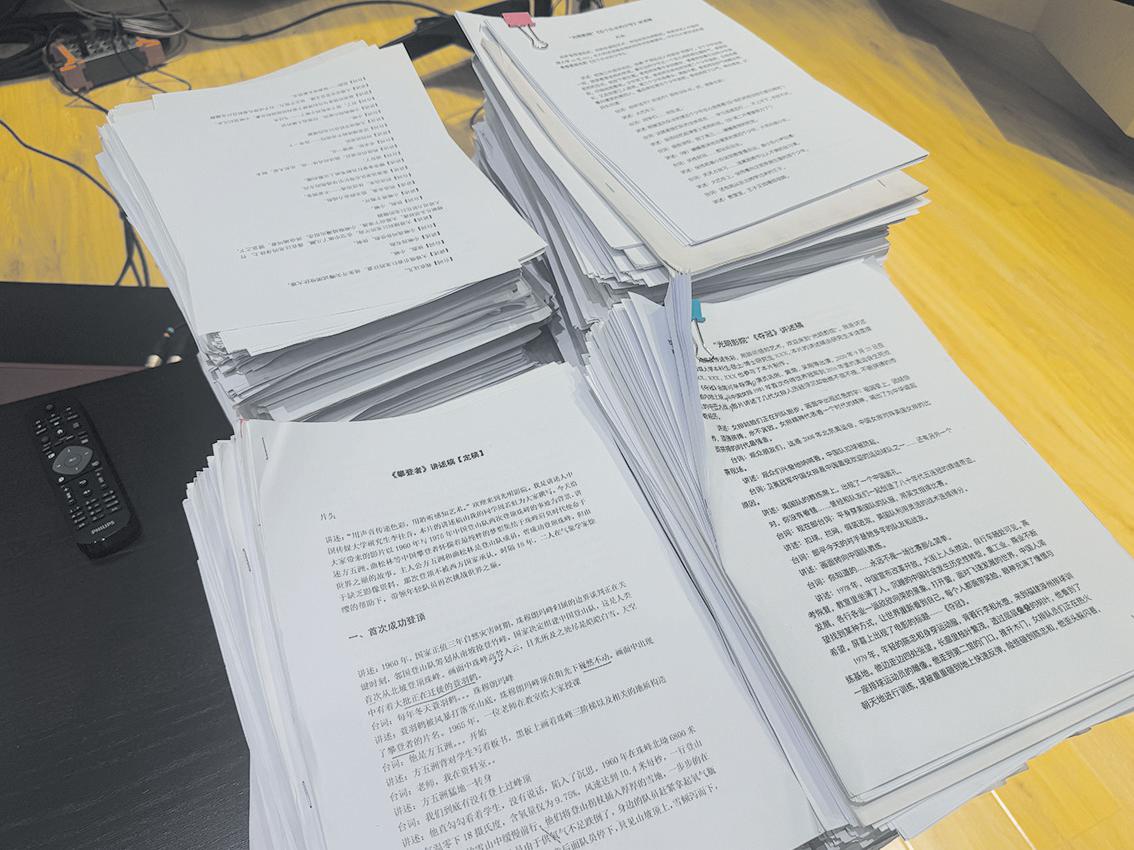 中国传媒大学“光明影院”的录制室内,讲述词文稿堆成小山。 新京报记者 熊丽欣 摄