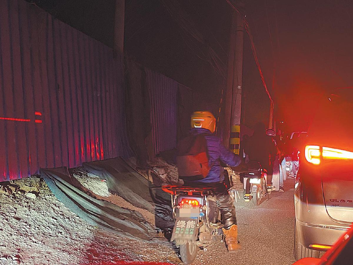 12月1日18时许,榆树庄村村委会南侧小路十分拥堵。 本版摄影/新京报记者 吴婷婷