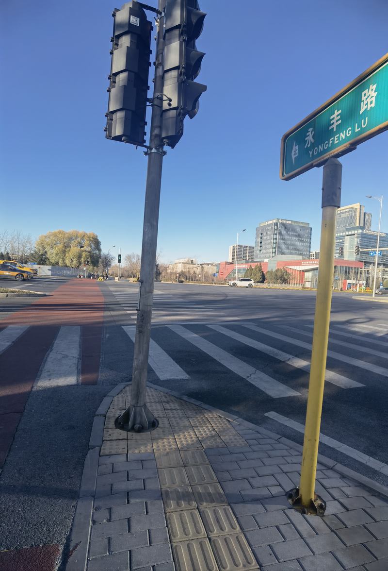 要想仅仅依靠盲道指引,通过永丰路与北清路这个路口,可不太容易:路口东南角,一组伸缩栅栏刚好堵住了盲道的去路;而在路口西南角,盲道等候区上还矗立着一处红绿灯。