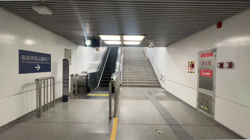 地铁天坛东门站A2口,出站共有四段阶梯,其中两段配有电动扶梯。新京报记者 刘婧瑜 摄