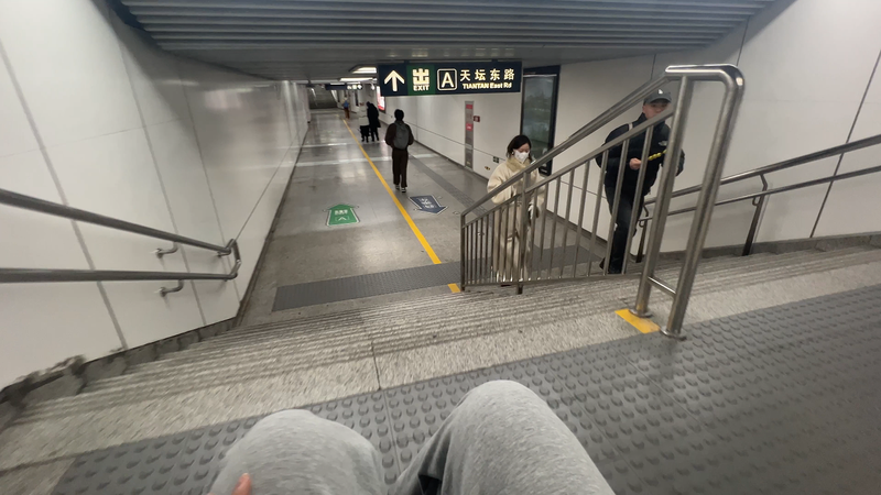 地铁天坛东门站A2口,记者体验坐轮椅出站,有一段阶梯没有电动扶梯。新京报记者 刘婧瑜 摄