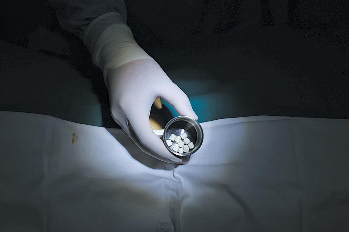 十粒白色的缓释型盐酸纳曲酮药片即将植入患者皮下脂肪层。