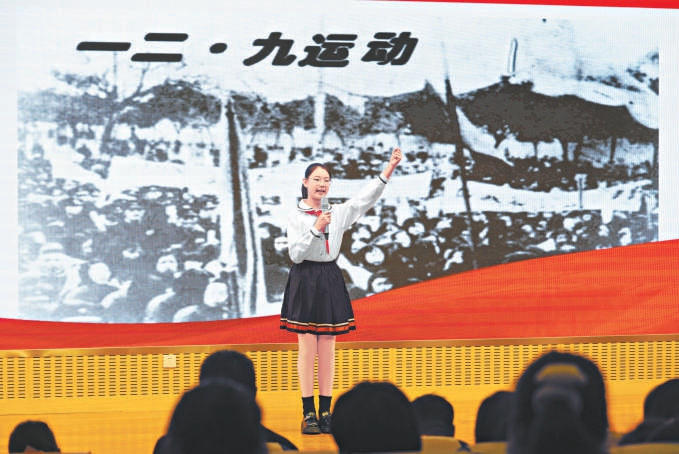 “今天,我站在这里,心情格外沉重,也格外激昂。因为我的思绪,穿越了90年的时光,回到了那个硝烟弥漫、山河破碎的年代,回到了那个寒风凛冽但热血沸腾的12月9日。”北京市大兴区魏善庄镇第一中心小学学生樊若依走到台上,情绪饱满地说,“我们要把爱国之心融入勤学苦读的奋斗里,把报国之志融入砥砺品德的修行中,把青春之力融入实现梦想的征程上!”