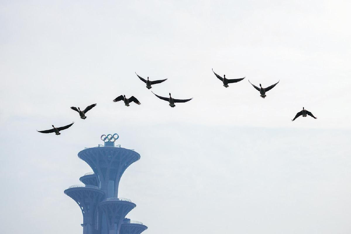 场景:鸿雁飞过奥林匹克塔。新京报记者王子诚 摄
