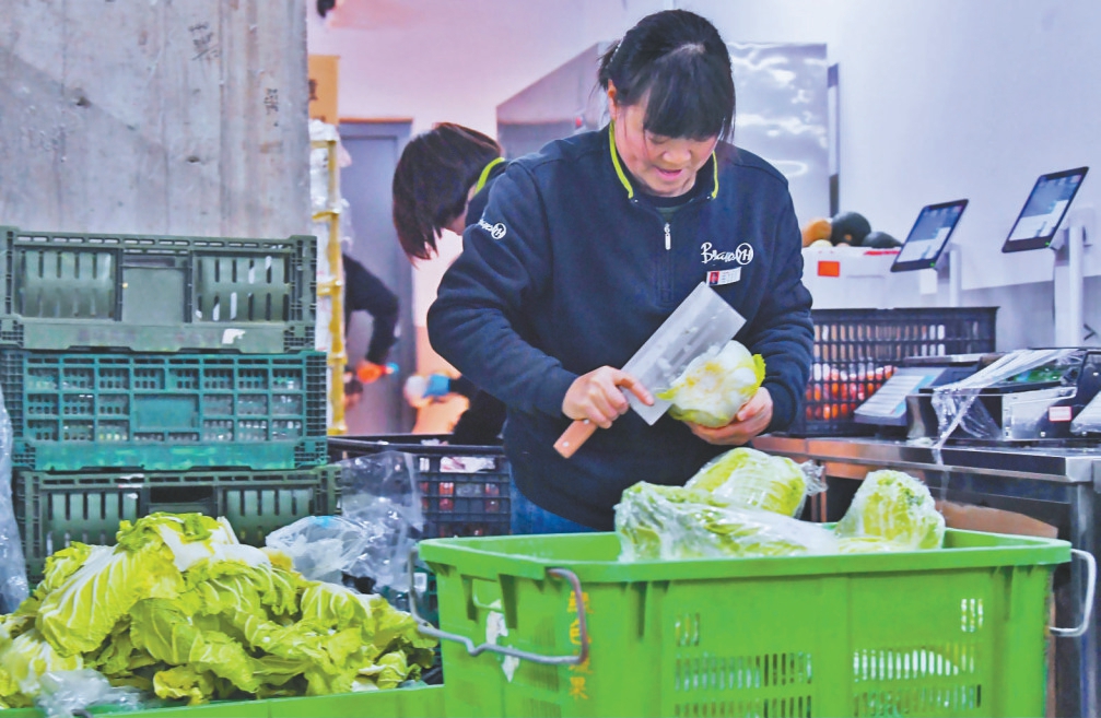 超市工作人员进行白菜去老叶打包作业