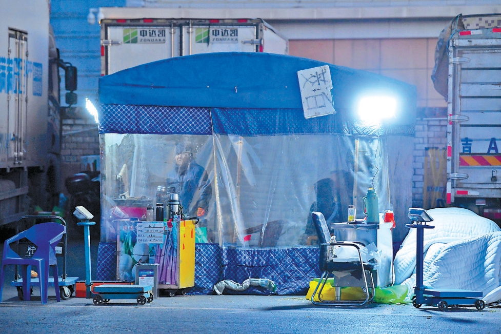 早6时的新发地市场,商户在临时搭建的棚子里等待顾客上门